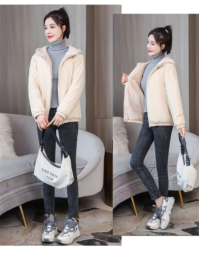Add Velvet Padded Coat Women 2025 Winter Hooded Outerwear Ladies Warm Cotton-Padded Jacket New Fashion Overcoat Short Female Top - Skin pink / XXXL